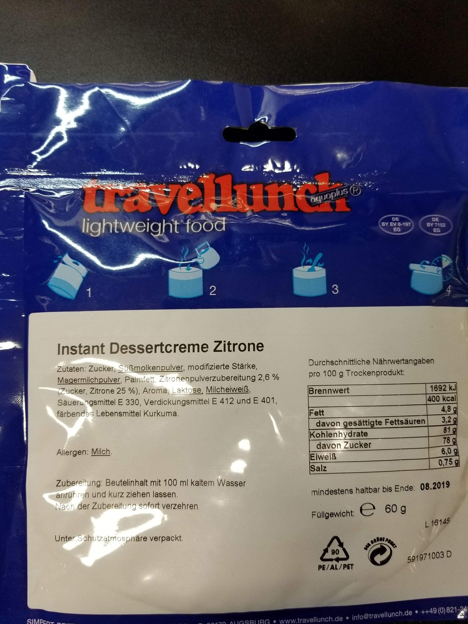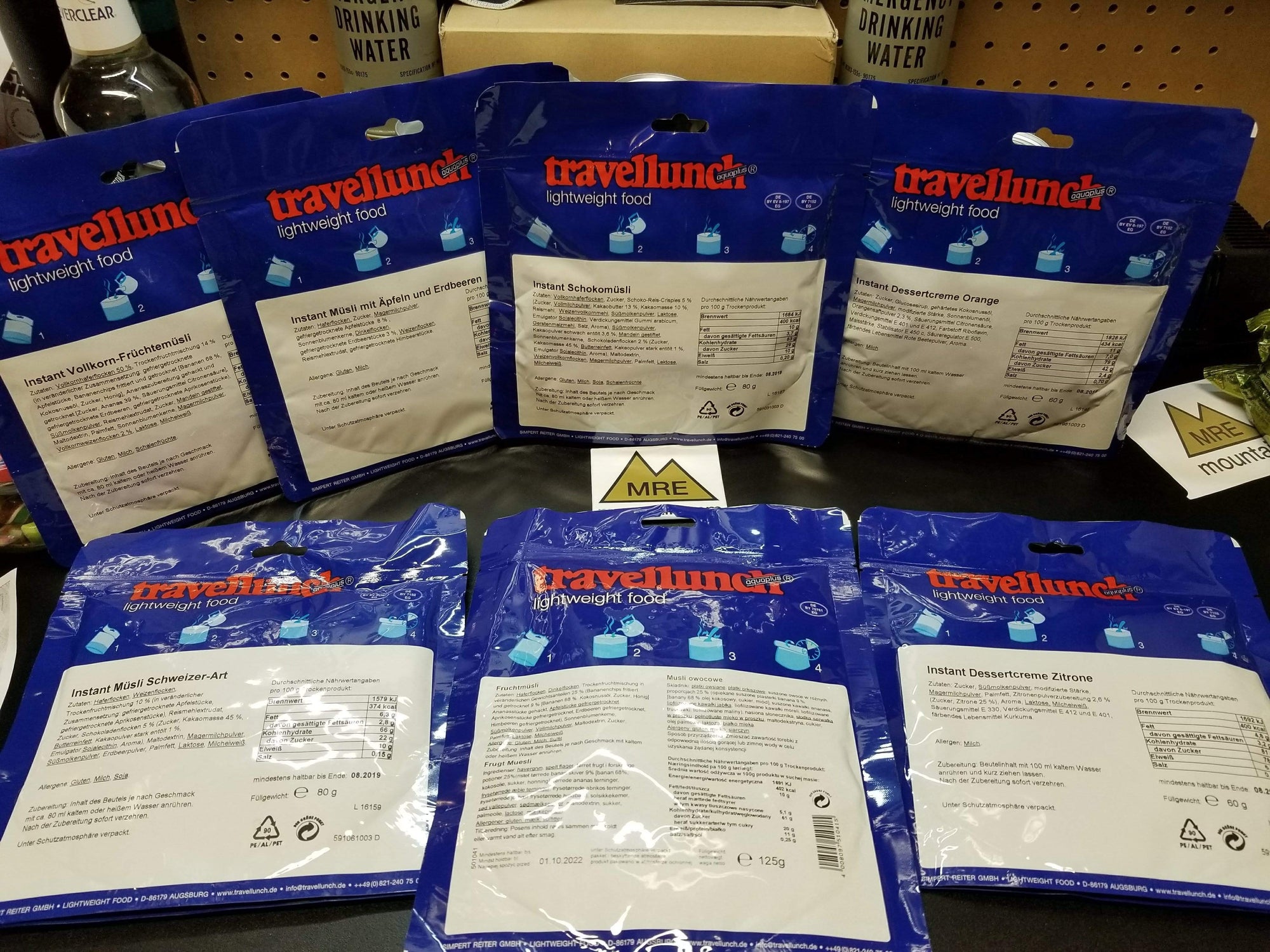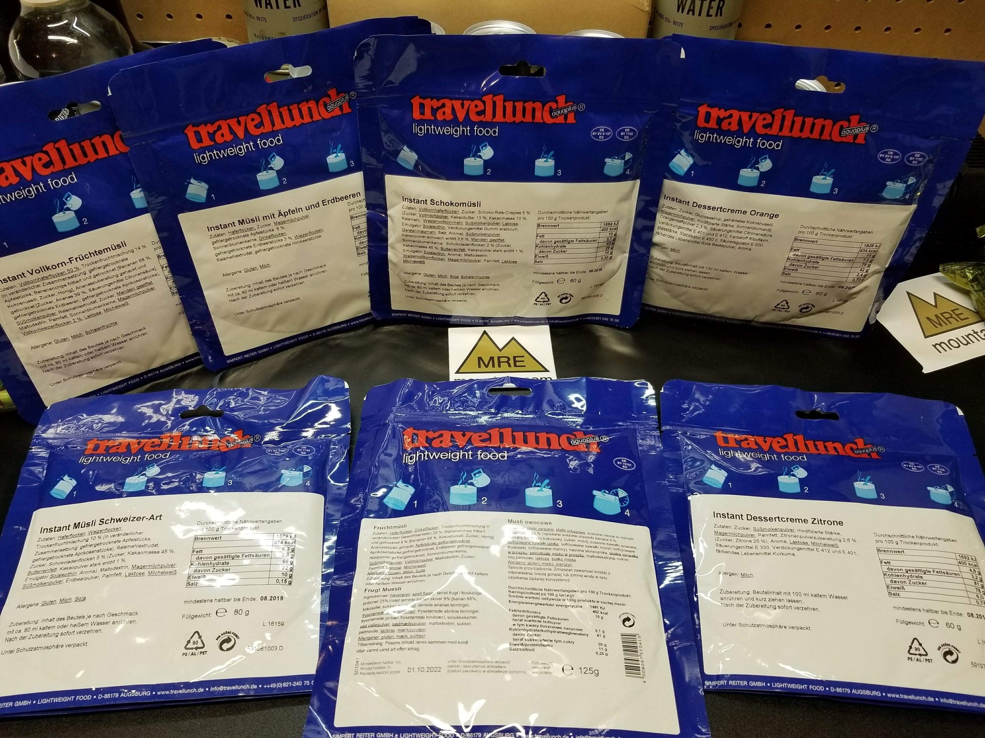 I offer a variety of Travellunch entrees, breakfast, lunch, dinner and dessert. Very hard to find these in the USA. MUCH better quality than Mountain House and some of the other USA based brands. Very little if any preservatives, additives or coloring. Wholesome, light food!