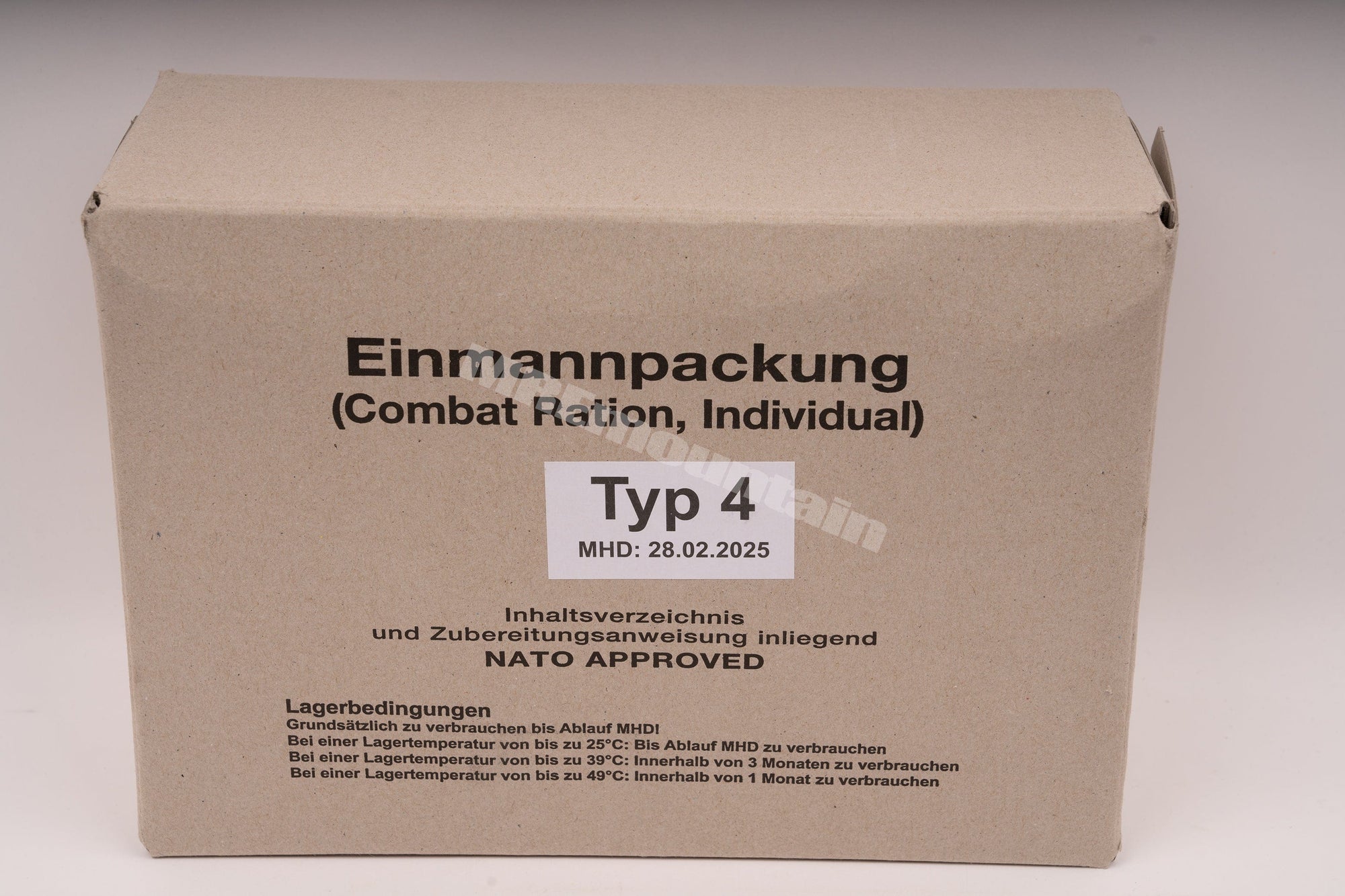 DeDuitse strijdkrachten EPA 24-uurs gevechtsrantsoen wordt geleverd met twee geweldige hoofdgerechten, waaronder ontbijt, crackers / koekjes, ingeblikt brood, jam en een verscheidenheid aan warme drankenmixen met cappuccino, thee en koffie. Maaltijden omvatten heerlijke Chili con Carne, kipfricassee, worstjes, varkensgoulash en bolognese noedels - en nog veel meer.