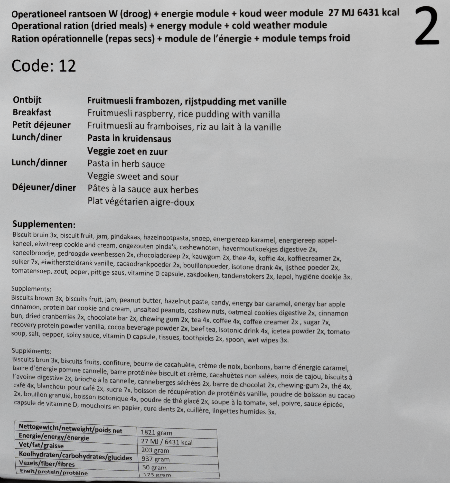 These rations were developed specifically for the Royal Netherlands Armed Forces’ cold-weather operations and feature a higher amount of calories that feature freeze-dried meals and porridge for breakfast.
