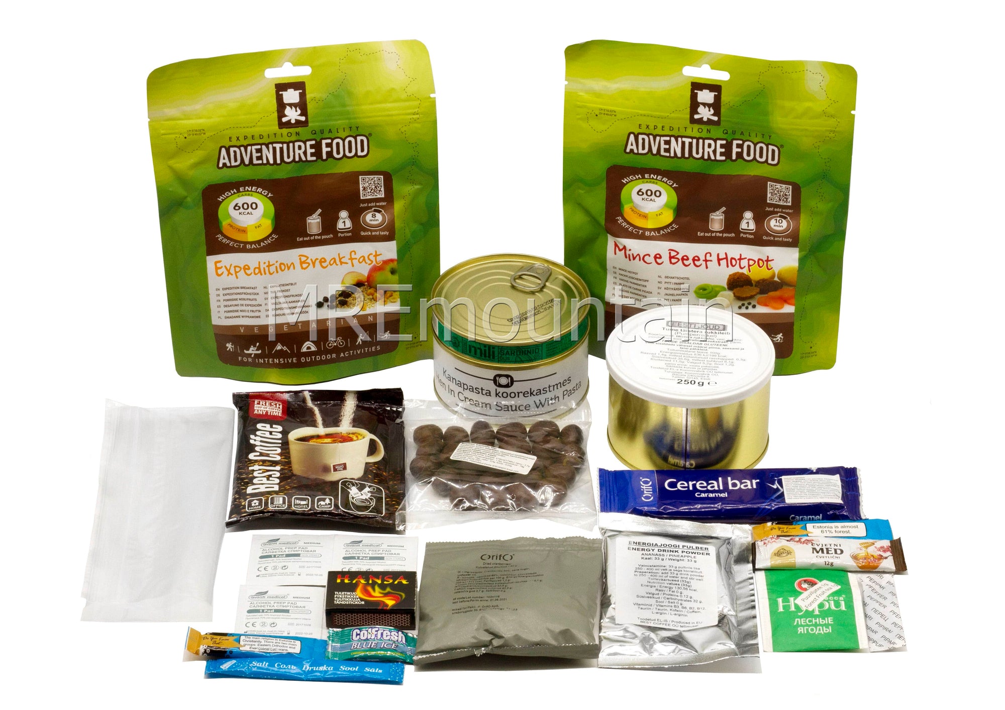 Menu 1: Chocolate Muesli, Beef and Potato Hot Pot, Beef Stew, Whole Rye Bread, Salt, pepper, instant coffee 3 in 1, cocoa drink powder, energy drink powder, dark chocolate with cornflakes and guarana, sweet crackers, raisin mix, white spearmint, disinfectant, plastic bag, matches.
