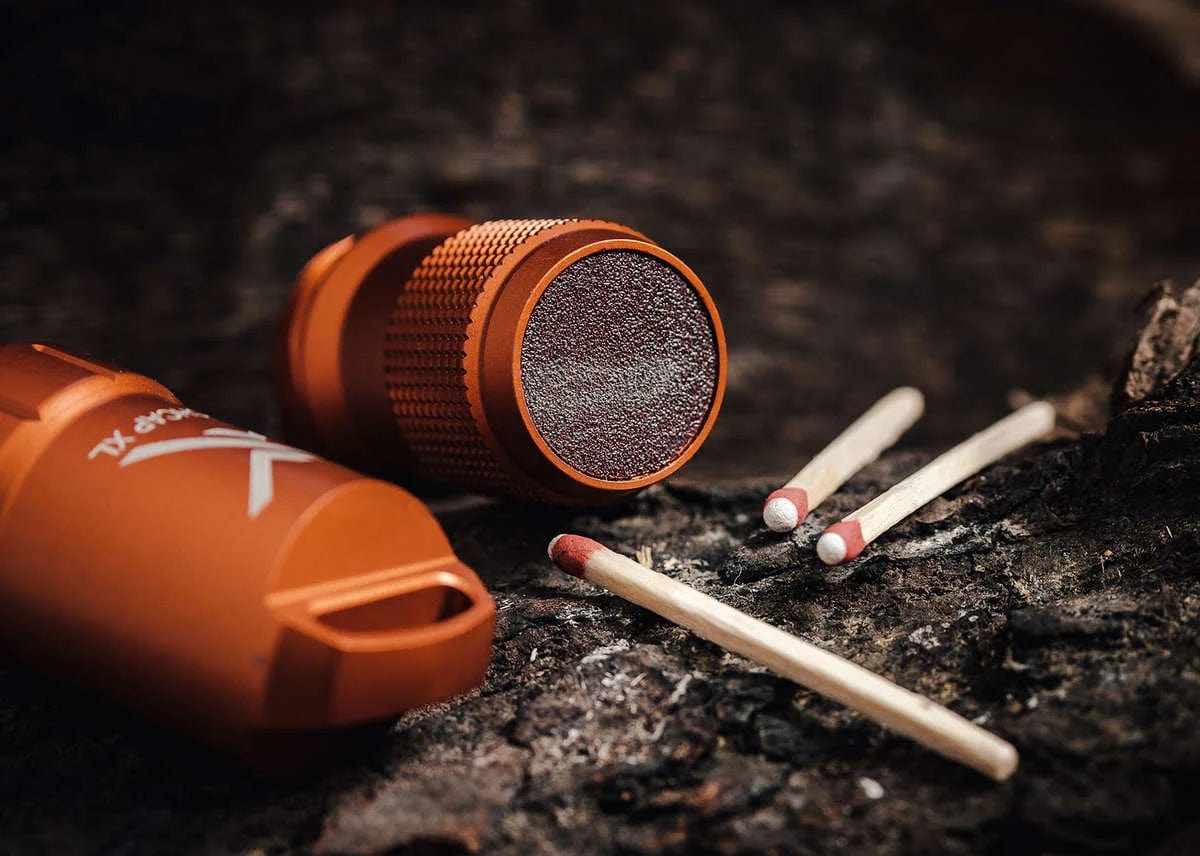 The MATCHCAP XL™ is a nearly indestructible waterproof match case for storing matches and other survival gear. An integral red-phosphorus striker is not only protected from rubbing against the matches but is also waterproof due to its location inside the o-ring sealed cap.