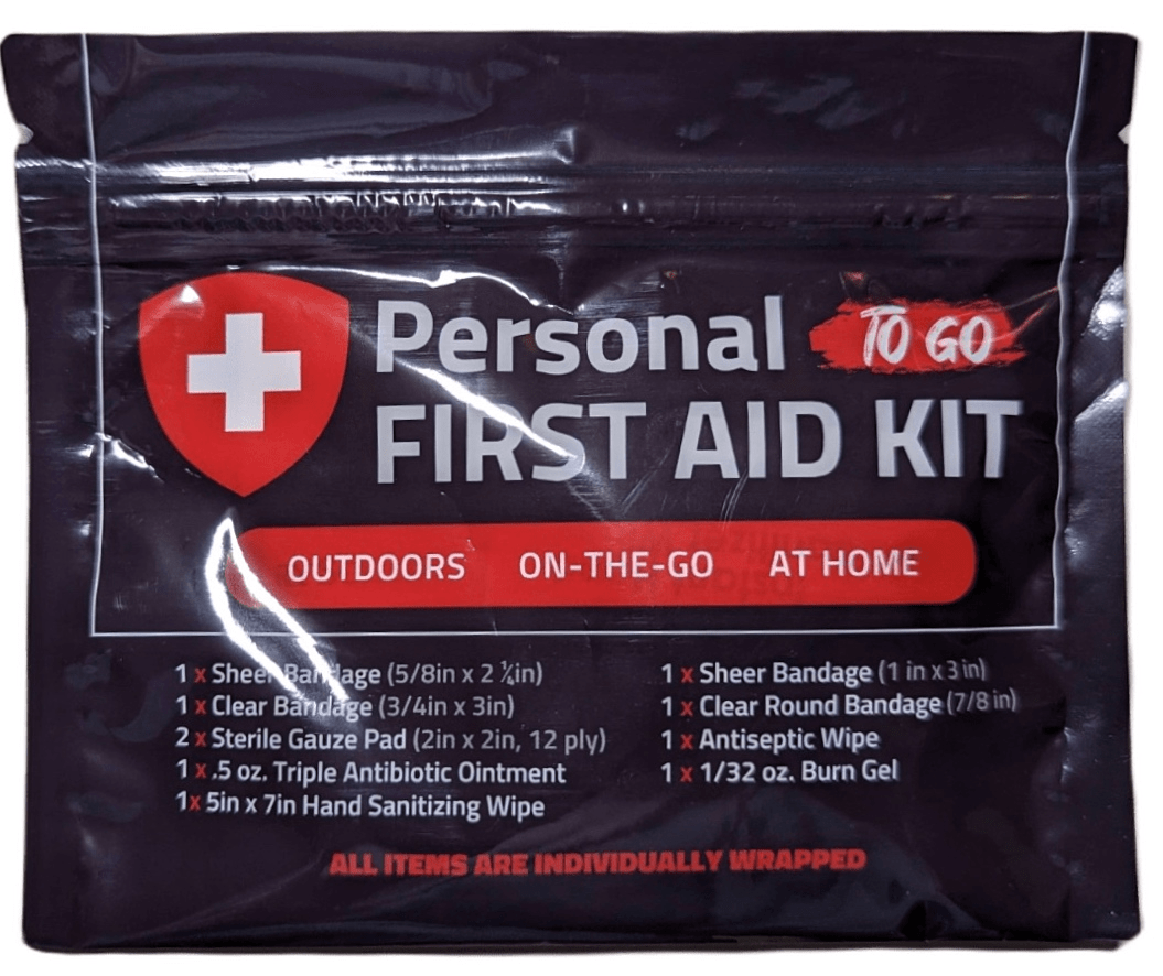 First Aid: Personal First Aid Kit (Sanitizing wipes, Triple Antibiotic Ointment, Antiseptic Wipe, Sterile Gauze Pad, Burn Gel, Assorted Bandages), Adhesive Dressing.